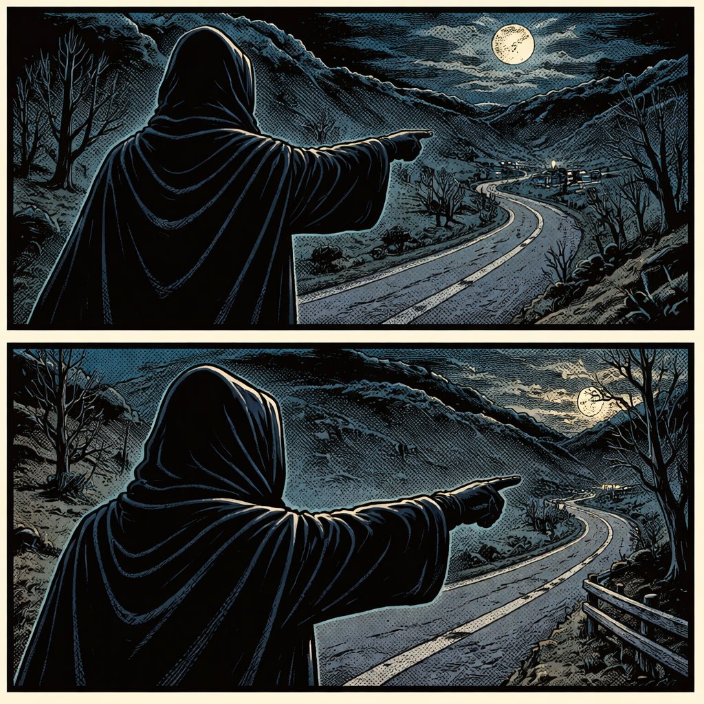 Two panels realistic, refined, no caricature a man in a black hooded robe stands on the side of the road. We see him in three-quarter of view from the back his right hand is extended as if pointing to something. It is hilly it is dark.