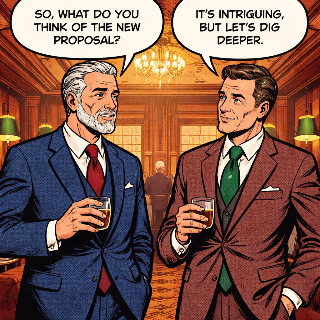Two very well dressed middle aged modern men standing in the interior of a private club. They’re having a discussion. Th...