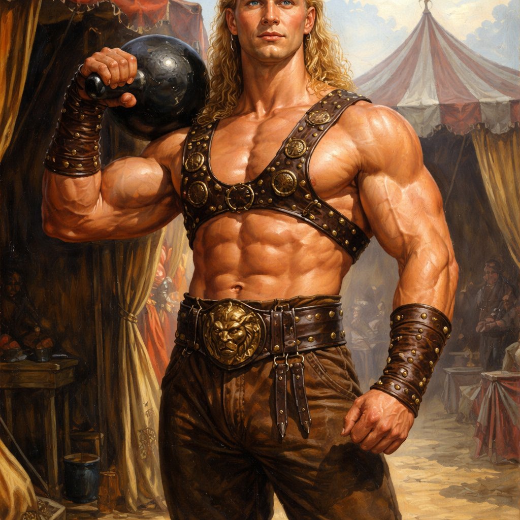 A tall muscular well~proportioned figure ”broad-shoulders, thick neck, giving an impression of sheer power“. His ”expression is often serene or determined, with deep-set blue eyes and strong brows, hinting at inner depth“. His haircut is a blonde mullet. He works at freak show as a strong man. His outfit consistsed of a gladiator like outfit but with brown pants.