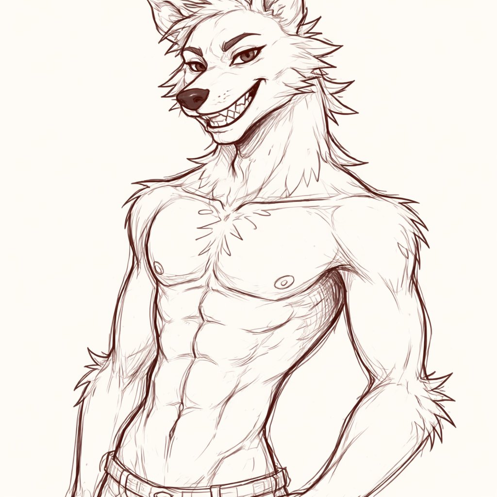 Hazbin hotel styled art : a bear wolf that is shirtless and has alastors body build and isn’t very furry
