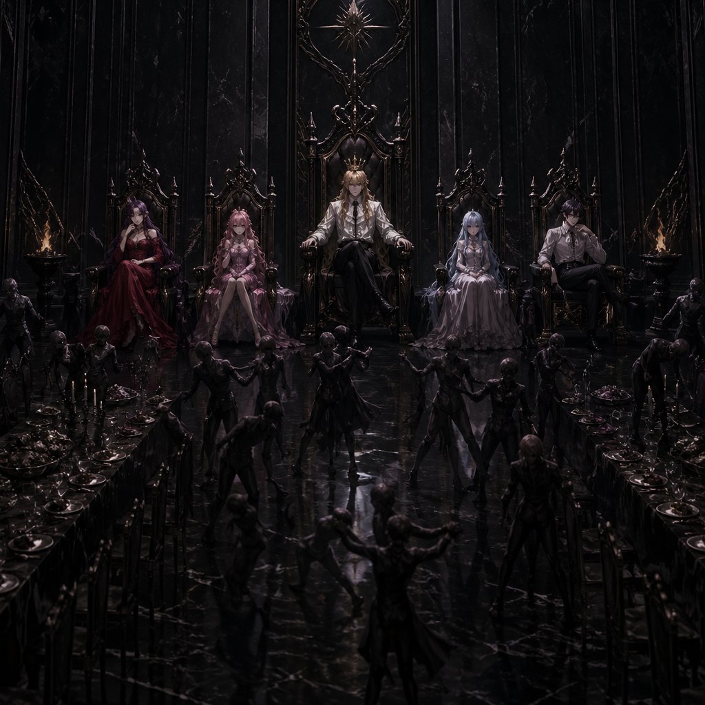 A big room that has five chairs in the fair end. The middle chair is the biggest one and a king sits in the chair. The king has golden hair and is wearing a big golden crown. He is wearing a white shirt and black pants. He looks strong and confident. To the left of the king sits a queen whose chair is a bit smaller than the king’s chair. She is has purple hair with golden stripes. She is wearing a red dress. She looks strong and confident. To the right of the queen sits a 19 year old princess. She has pink hair with black stripes and blue eyes. She is wearing a pink dress. To the right of the king sits another 20 year old princess who has blue hair and blue eyes. She is wearing a white dress. She looks strong and confident. Next to the 20 year old princess is an 1& year prince. He has black hair with purple stripes. He is wearing a white shirt and black pants. He looks strong and confident. He also looks to be in high alert. The room is big with white walls that are polished. The floors are black. There are tables and chairs around the room. At the side of the room are tables that have food on them. There are people dancing in the center of the room in a proper way.