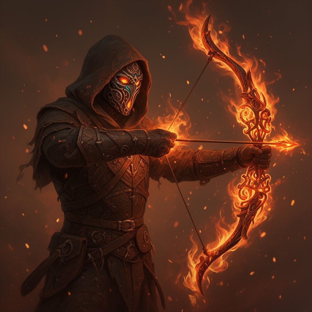 Create handsome hero Rhen the Fire – A lean, muscular man. He wears layered, flowing desert robes dyed in warm reds and...
