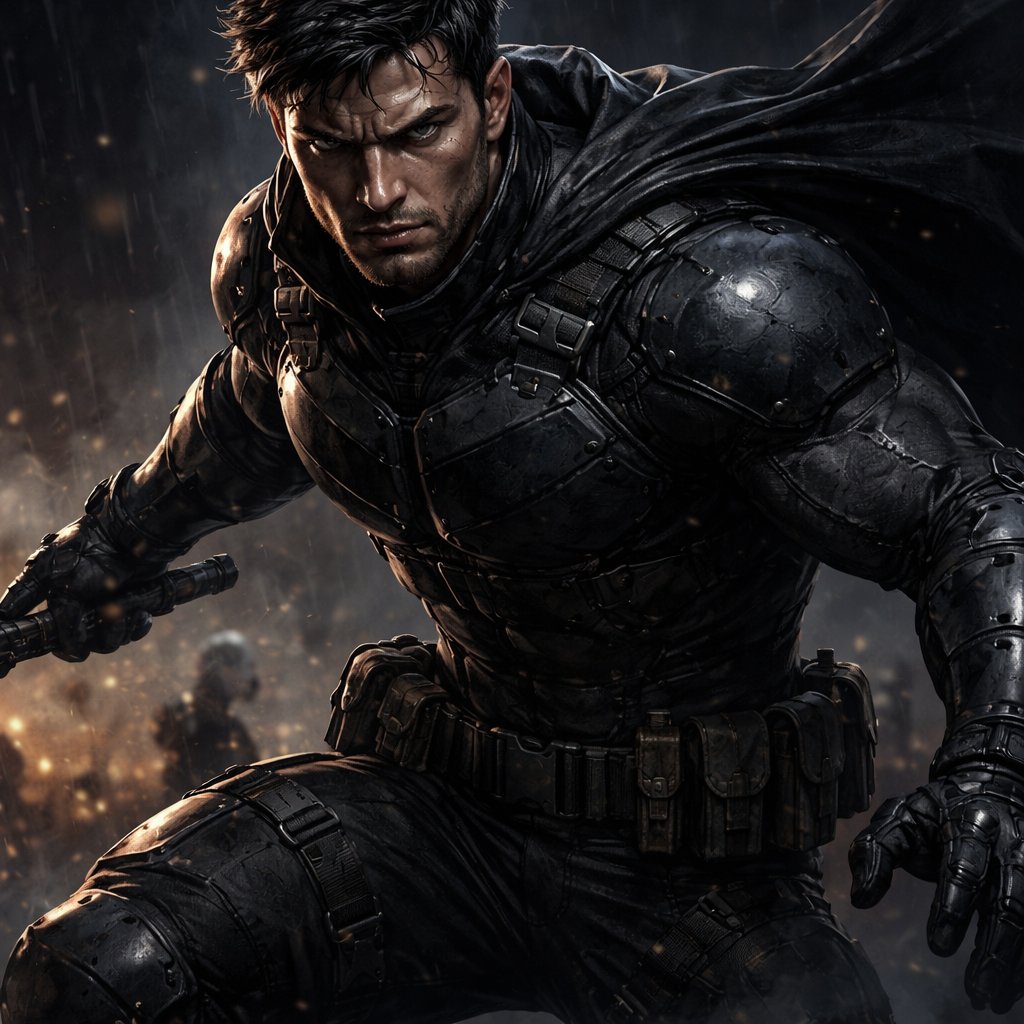 Muscular male with athletic build that is a dark vigilante with gadgets and angry