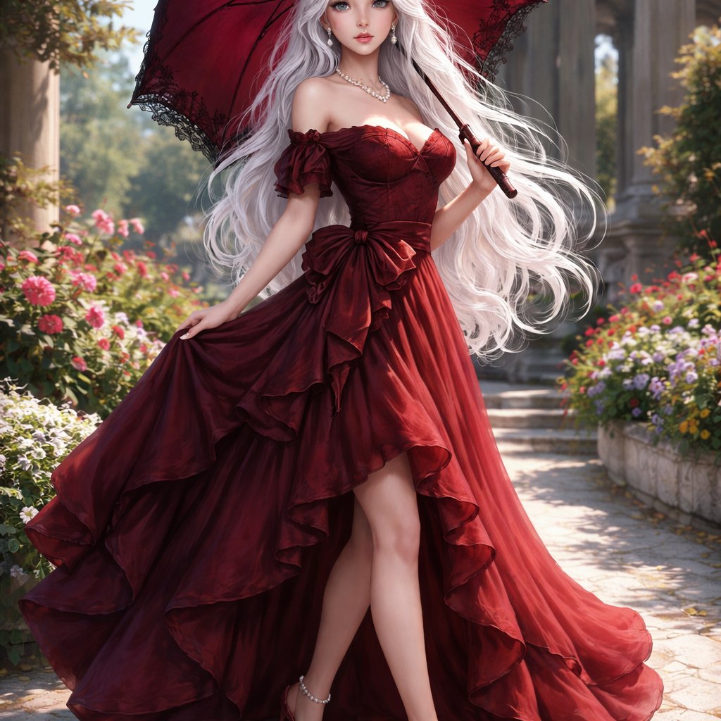 A girl with long white hair to the waist and sapphire blue eyes, pale skin and rosy red lips standing in a royal garden wearing a long dark red gently ruffled dress with a long bow in the back with a pearl necklace and red high heels with pearl straps holding a deep red parasol with black lace