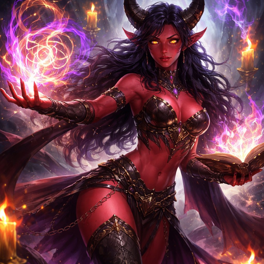 Crimson skinned, orange eyed female tiefling witch wearing skimpy armor