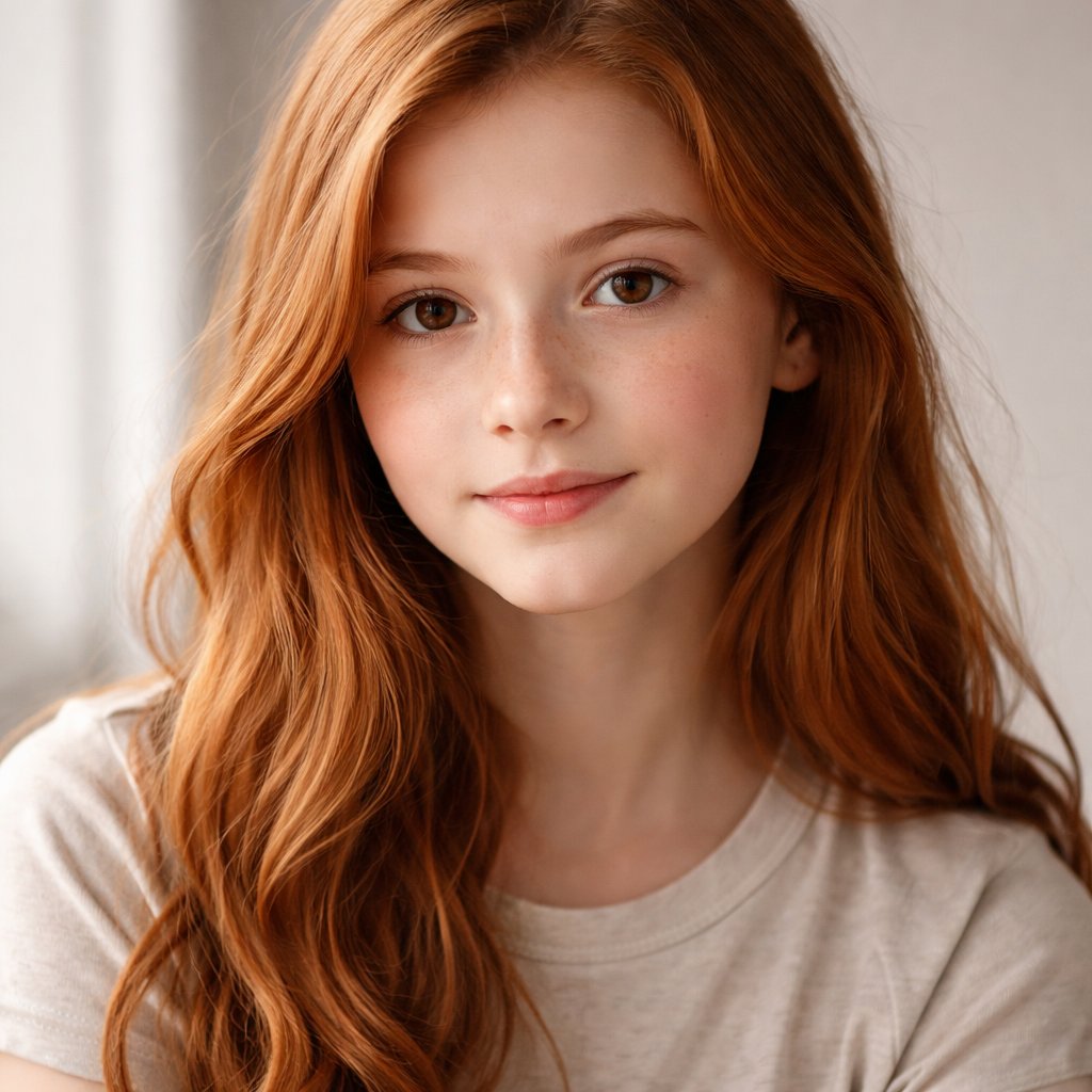A 14 year old girl who has red hair and brown eyes.
