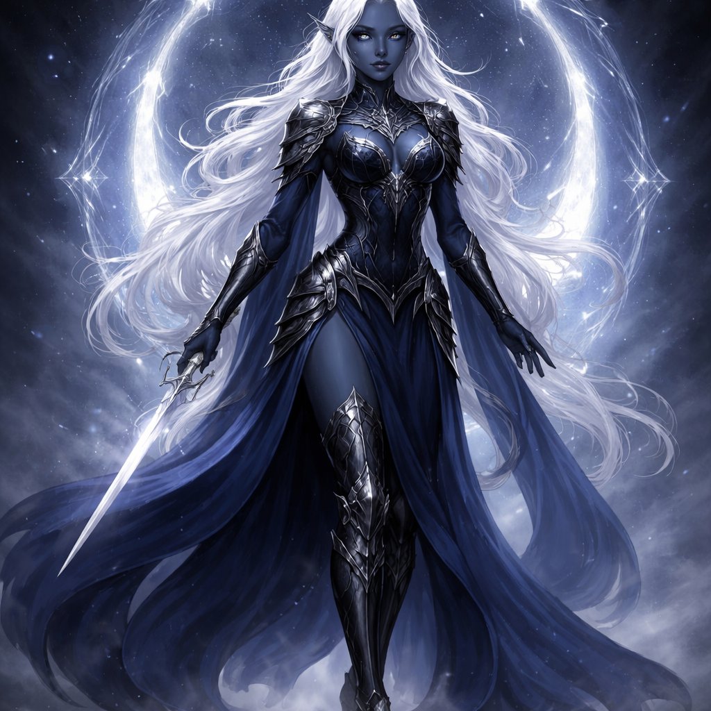 A beautiful Drow woman with long flowing white hair, dark grayish blue skin, large silver eyes, wearing dark blue flowing robes with armor plates, knee high heeled armor boots with Eilistraee’s symbol surrounding her.