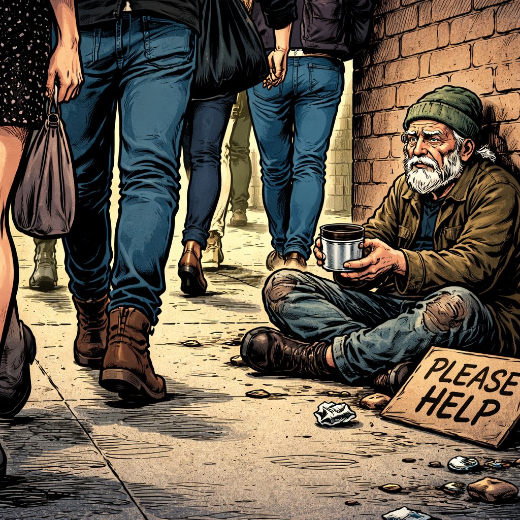 Realistic, refined, no caricature no speech bubbles. A poor skinny feeble old man is sitting cross legged against the wall begging we see men and women walking by paying no attention. The beggar is on the right, and the people are walking across the screen to the left. We see mostly waist down to their feet.