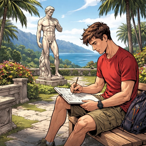 Refined realistic, no caricature no speech bubbles a young man it is early 20s is sitting with a drawing pad on a bench ...