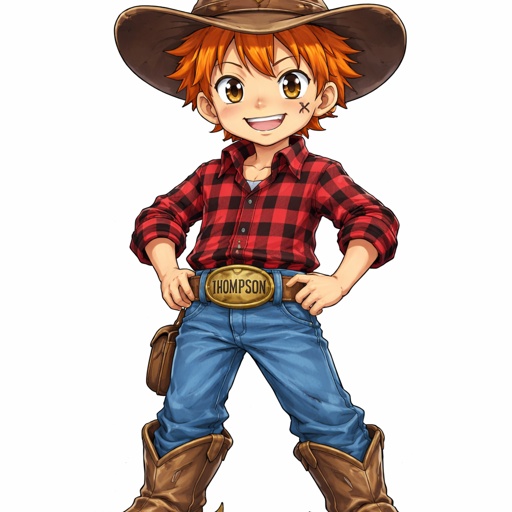 8 year old boy wearing a black and red checkered button down long sleeve shirt, brown leather cowboy hat, brown leather belt with silver belt buckle that says *Thompson* on it, blue jeans with a pair of leather cowboy boots tucked under them, and a scar across his cheek. This character should look like he’s from the anime One Piece.