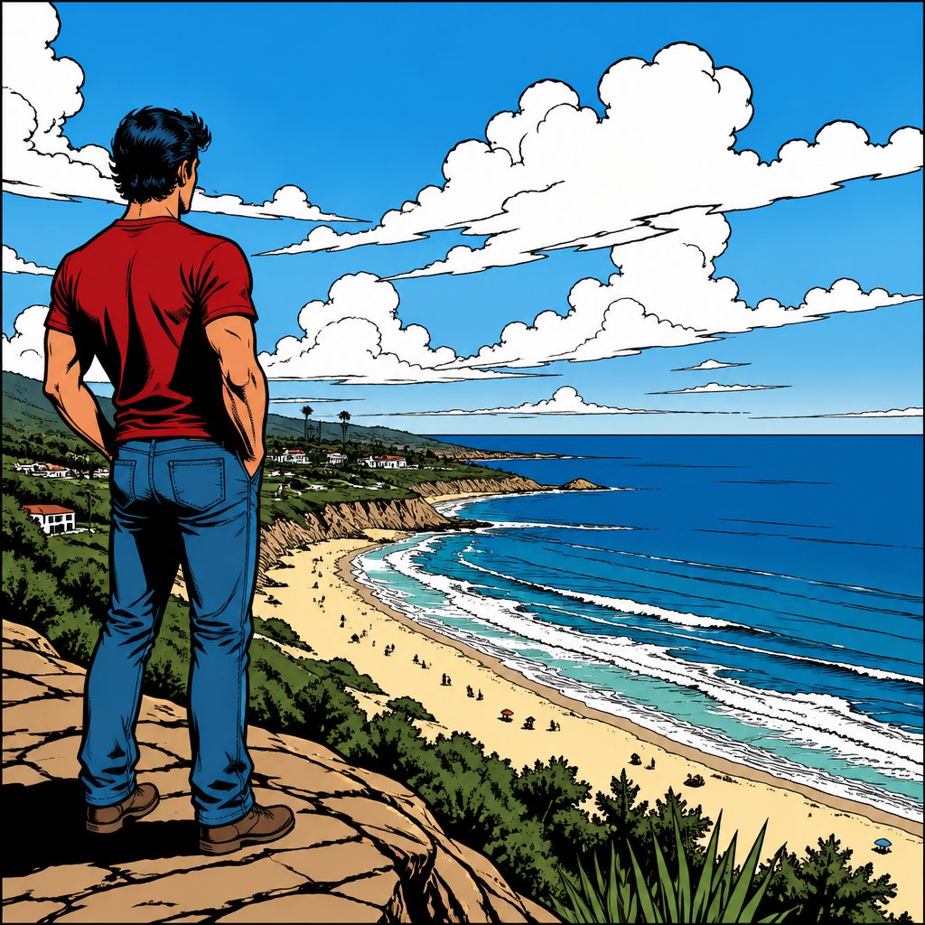 Realistic, no caricature, no speech bubble overlooking a beach and sky