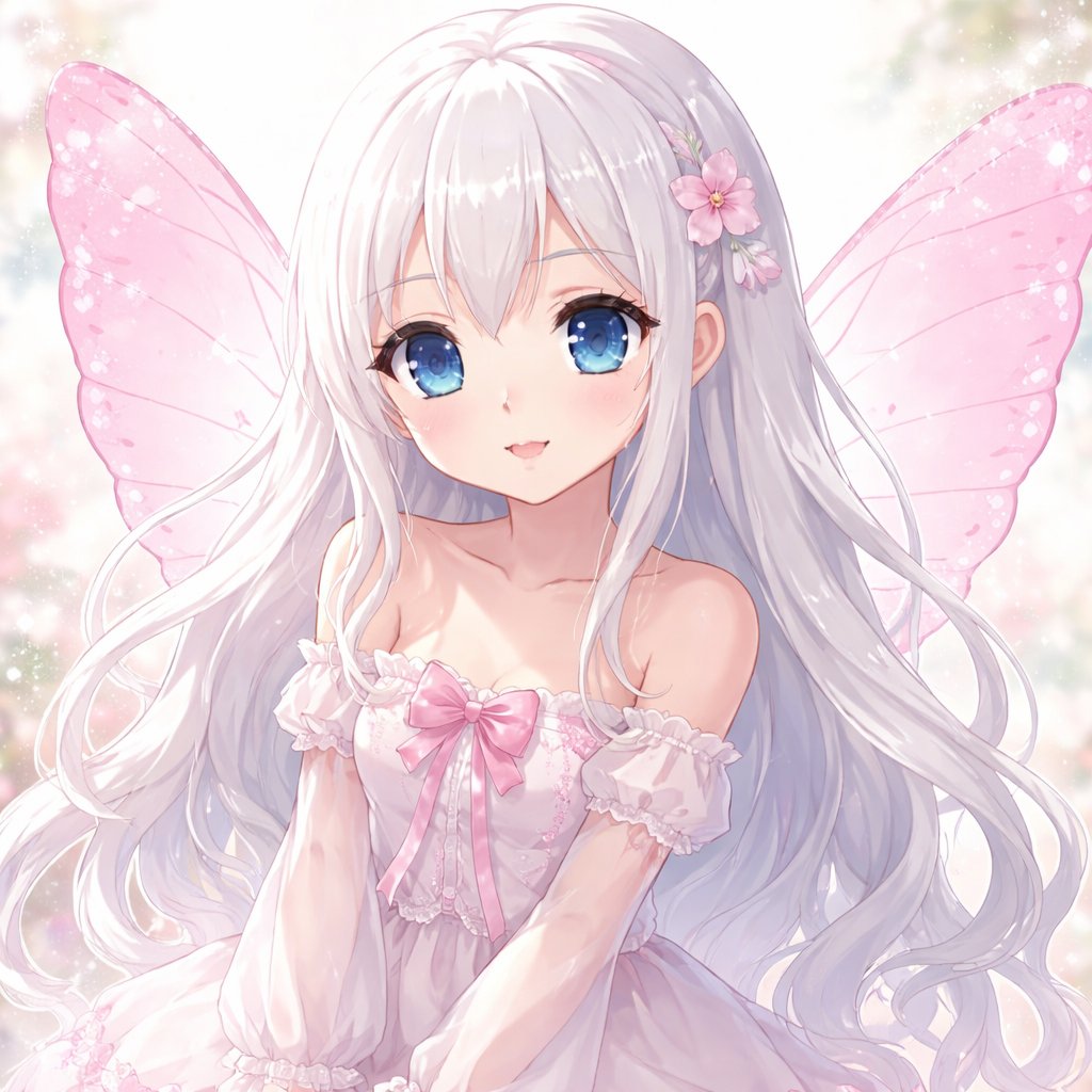 Young white female with white hair and blue eyes also has pink butterfly wings