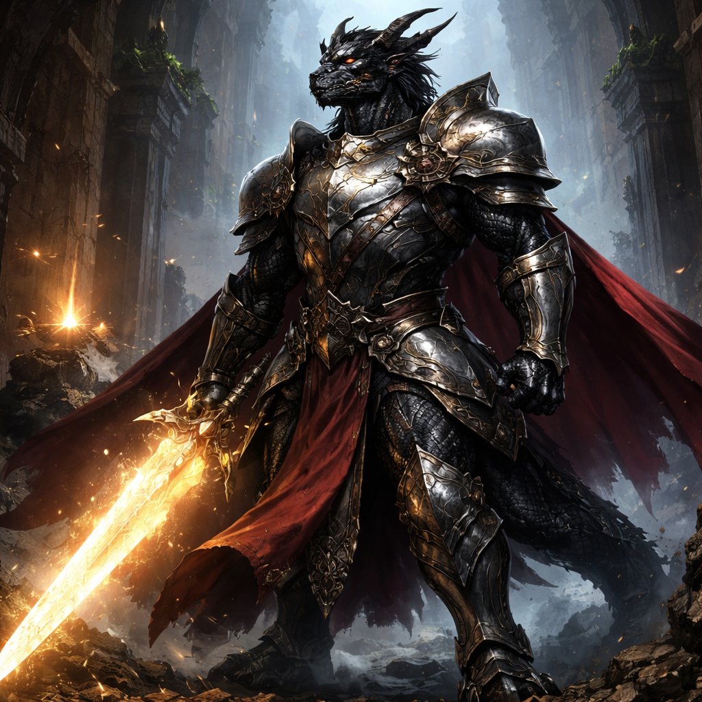 generate a half draconic human who is humanoid with draconic scaly arms and legs. he is a paladin wearing plate armour a...