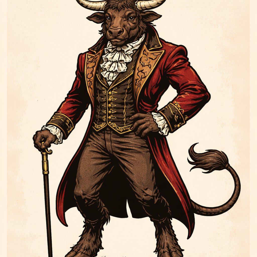 A male Minotaur that’s 6 1/2 feet tall and His Key Features are. His head looks like a mixture between Cretan bull and a human with deep set cattle like brown eyes, large powerful gleaming curved horns like his fathers. He has a well~proportioned figure/body and a long tail, with his skin/fur a captivating Taupe color. He works at freak show as the ringmaster, his outfit consists of a crimson tailcoat, frilly shirt, stunning blazer, pants and top hat. His abilities are Reality Rejection, Time Manipulation (Chronokineses), Zoolingualism (Language of Cattle only), Human Speech.