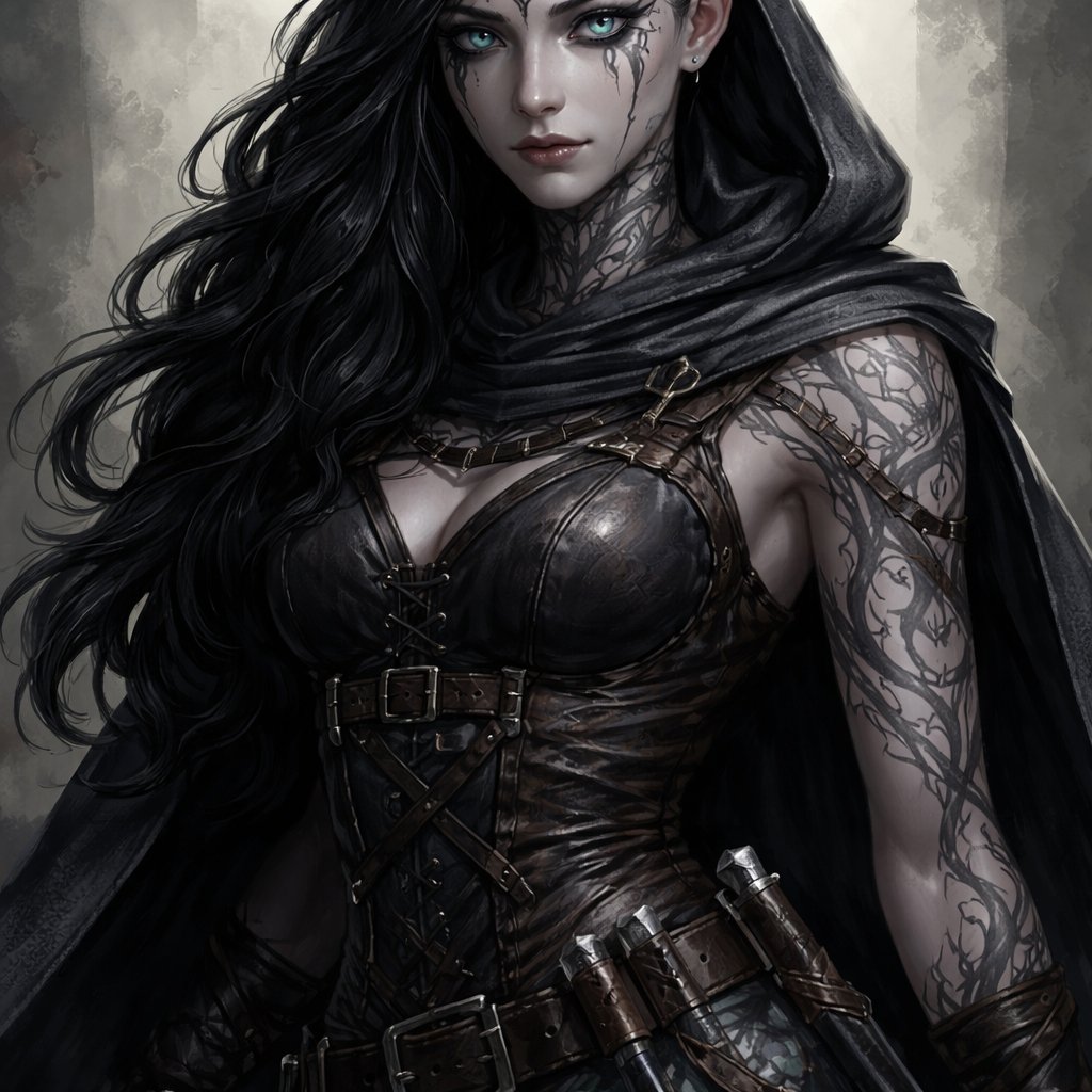 A female goliath from dnd with light grey skin, the right eye is dark blue and the left is completely white almost fogged over. Her har is black and she is a rouge. She has two tattoos that start at a point under her eyes and goes up to her her and then twists down to her back around the legs to the toes but you only need to generate her portrait (as in mostly her face and a bit of her torso). She is 20 and wears a bit more clothes, she is probably wearing a cloak but the hood is not up and