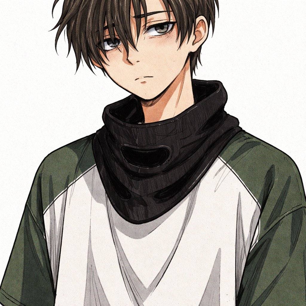 An 18-year-old boy with short hair, longer bangs on the right side falling over his eye, a loose middle part, and shorter bangs on the left side slightly covering the eye. He has hooded gray eyes and an expressionless face with a subtle hint of sadness. He is wearing an oversized t-shirt with a dark green section on the shoulder. A black ski mask is not worn on the face, but hangs loosely around his neck like a scarf.