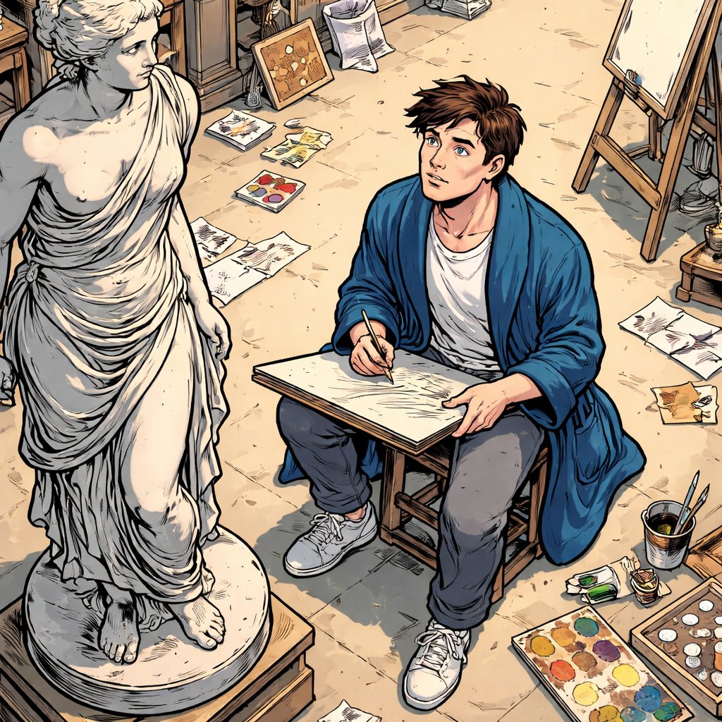 Realistic, refined, no caricature no speed bubbles a young man in his 20s in a robe is sitting with a drawing pad looking up at a sculpture drones view 3/4 from the front full body long shot.