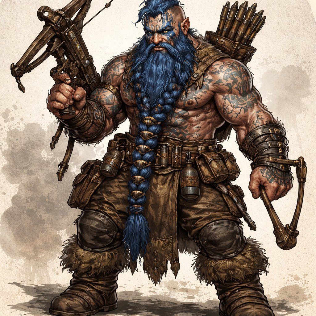 Blue haired dwarf 6 foot tall tattoos all over his body war paint on his face uses a crossbow and slingshot he is muscular and has a long braided beard