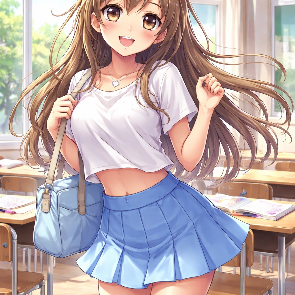 Hot Anime girl at the school in a white loose crop top and sky blue mini mini skirt.
