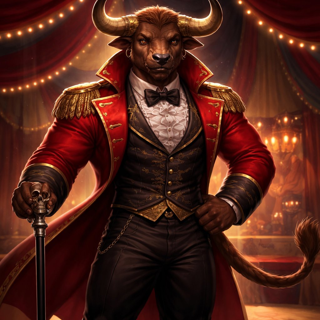 A male chestnut brown Minotaur with deep set cattle like brown eyes, large powerful gleaming horns like his fathers, a well~proportioned figure/body at lest 6 foot tall, long tail. He works at freak show as the ringmaster.
