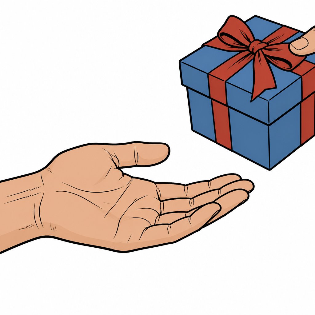 No caricature, no speech bubble, realistic An open right hand is flat receiving a gift