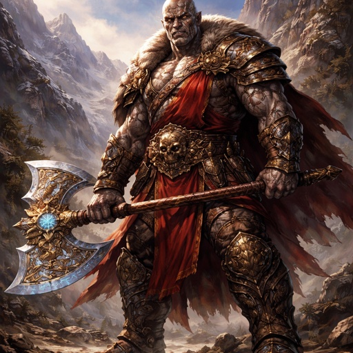 A Goliath fighter with a brown skin tone no hair and no beard wearing a red tunic holding a big battle axe he looks lik...