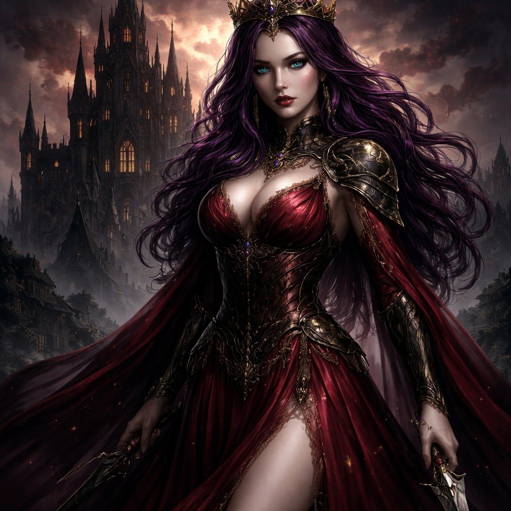 A 38 year old queen who has purple hair with gold stripes and has blue eyes. She is wearing a red dress. She looks stron...