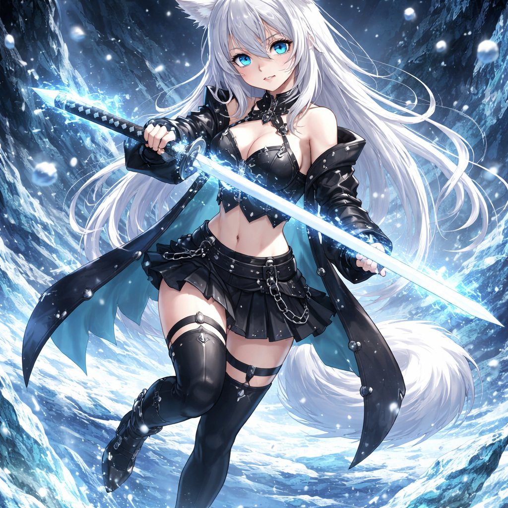 Fully body view anime-style young woman long white hair with small breasts with fox ears and tail. Gothic black and teal leather clothes aqua eyes she holds a katana with an ice aura background is that the floor is icy where she stands splash art