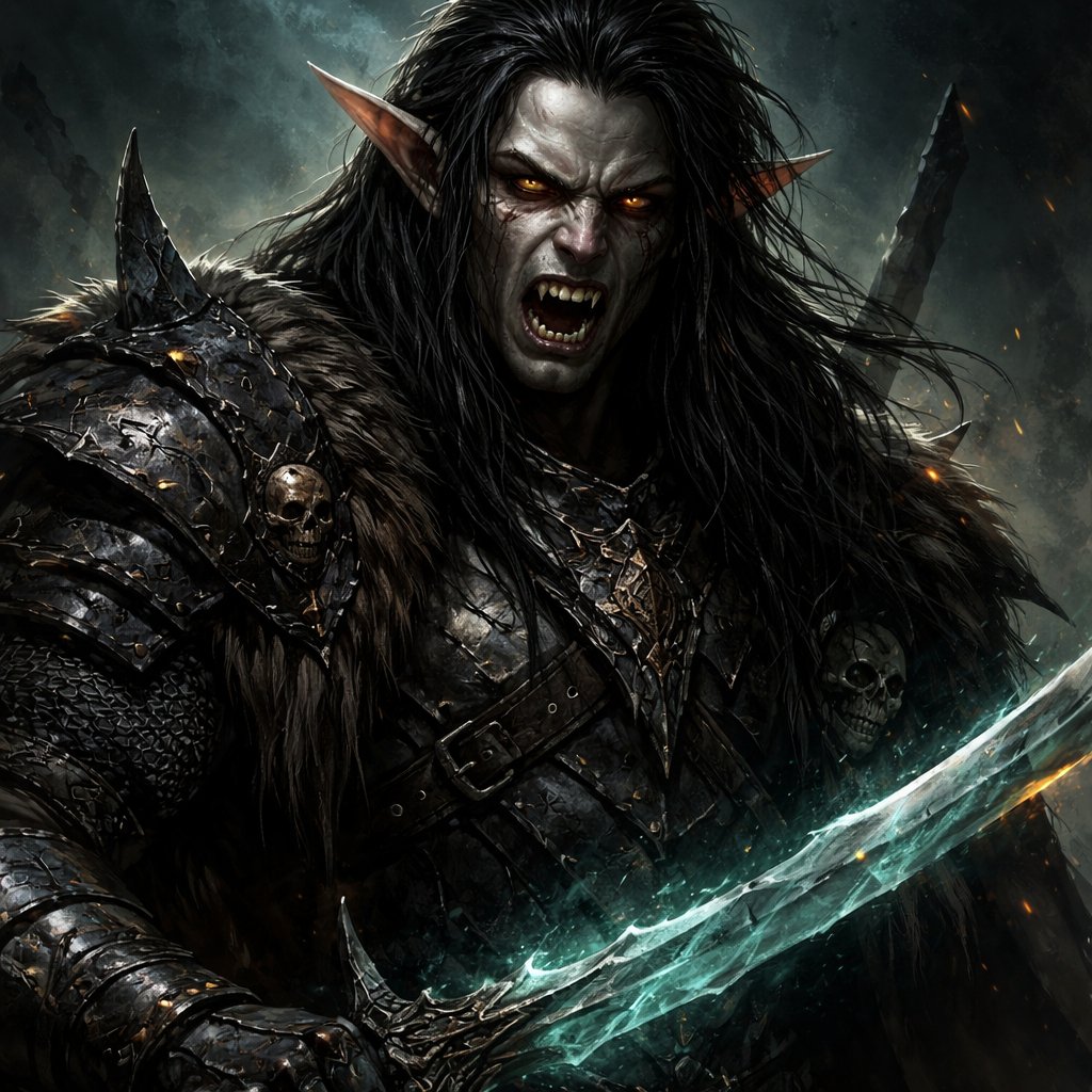 Gerate me a Lord of the Rings Charakter, he will be a half elven, Half Uruk-hai character, male, black Hair and Fangs, h...