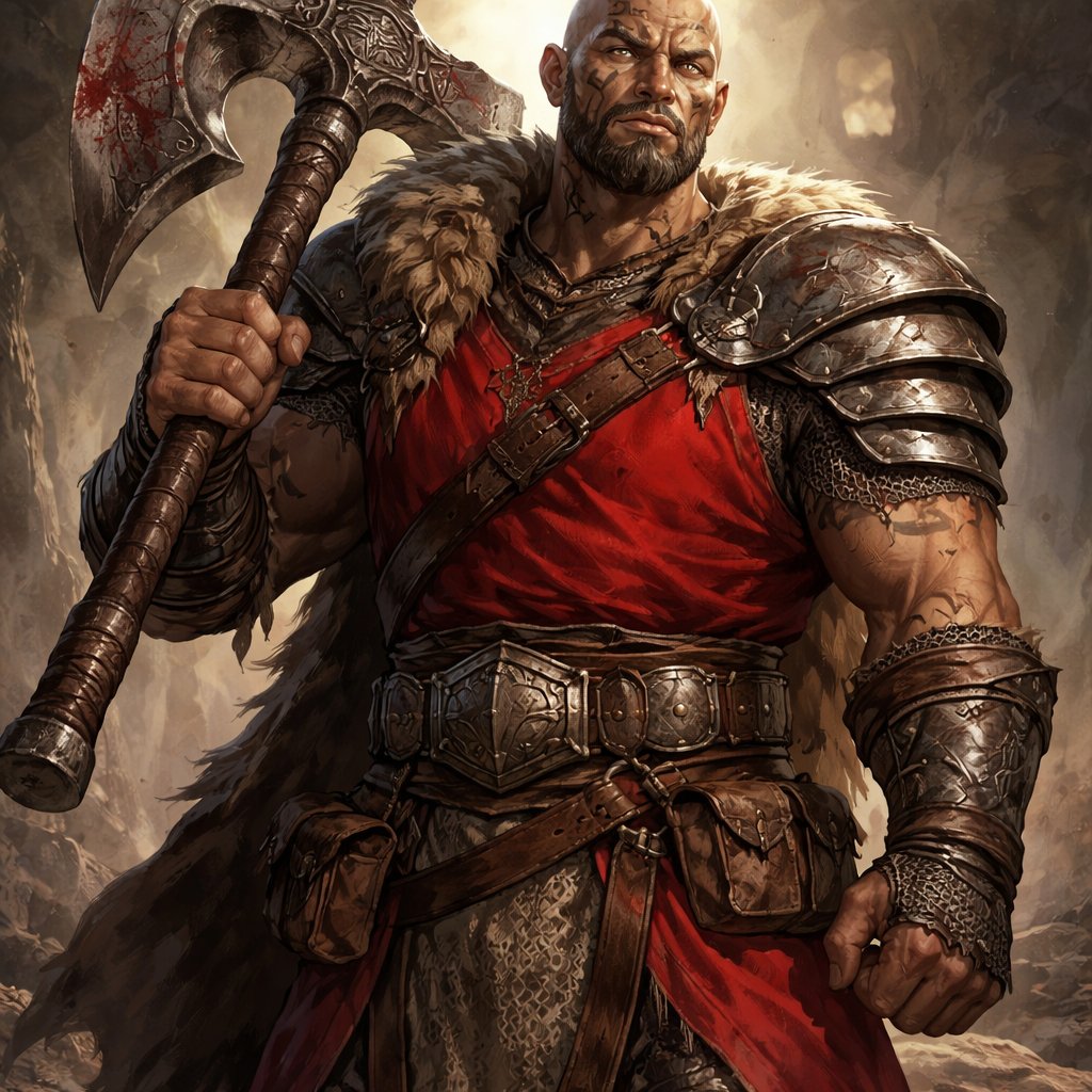 A Goliath fighter with a brown skin tone no hair wearing a red tunic holding a big battle axe he looks like a humble man