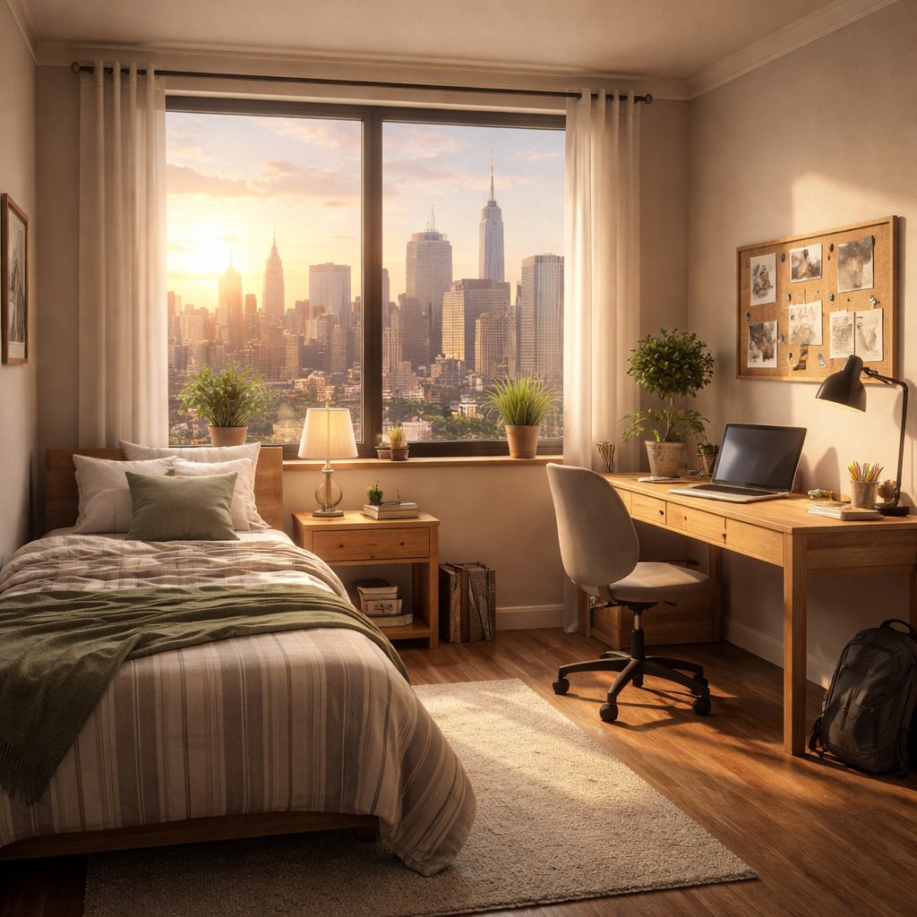 A bed that has a huge window that overlooks a city at the center of the room. In the left corner of the room next to the window is the bed that is a twin sized bed that sits up against the left wall. To the right of the window is a desk and chair that sits in front of the right wall. The room is a decent size.