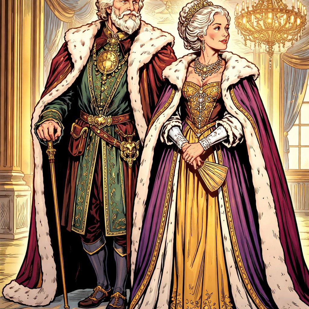 Realistic, no caricature, no speech, bubble Full body and head Three-quarter rearview of an elderly couple, very wealthy in Renaissance robes. The old man has a blonde gray beard and the old woman has white hair. They’re facing someone we cannot see in the right side. The background is a ballroom with no other people.