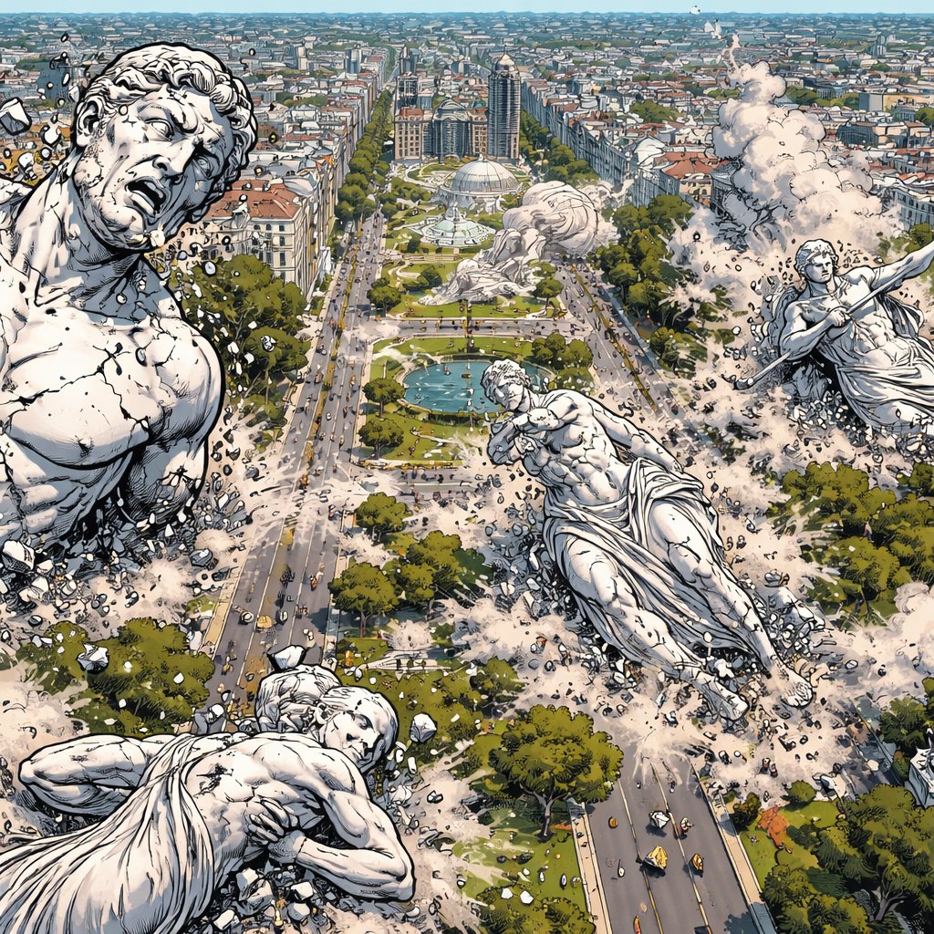 Refined realistic, no caricature no speech bubbles big white statues, falling over and breaking long-distance shot drone view