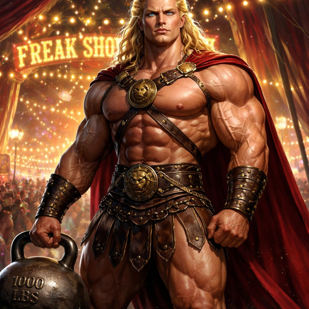 A tall well~proportioned figure/body with “broad-shoulders, thick neck, giving an impression of sheer power”. He has “rippling muscles on his, arms, chest, and legs”. His haircut is a blonde mullet. His “expression is often serene or determined, with deep-set blue eyes and strong brows, hinting at inner depth". He works at freak show as a strong man. His outfit consistsed of a modern gladiator outfit.