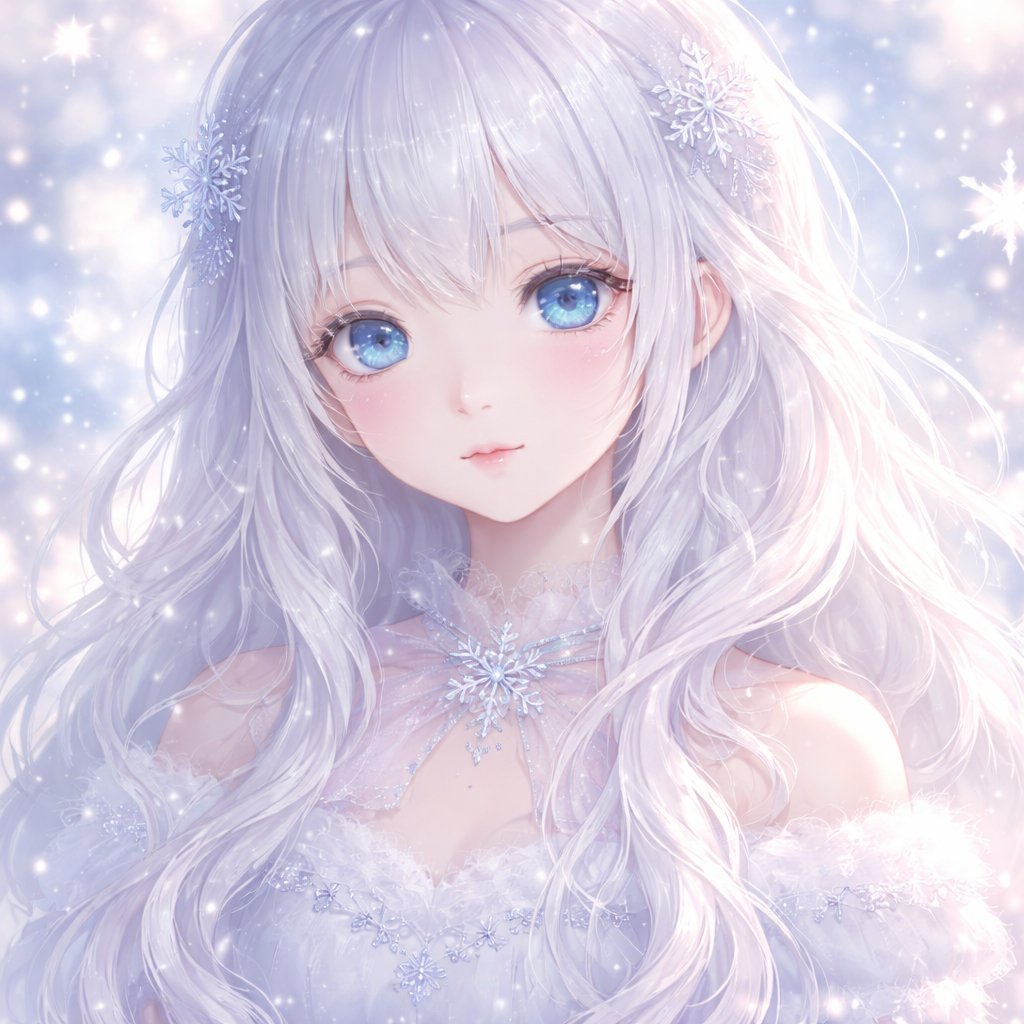 Young girl with white hair being long at the bottom and shortish at the top and blue eyes, her features being like the personification of snow