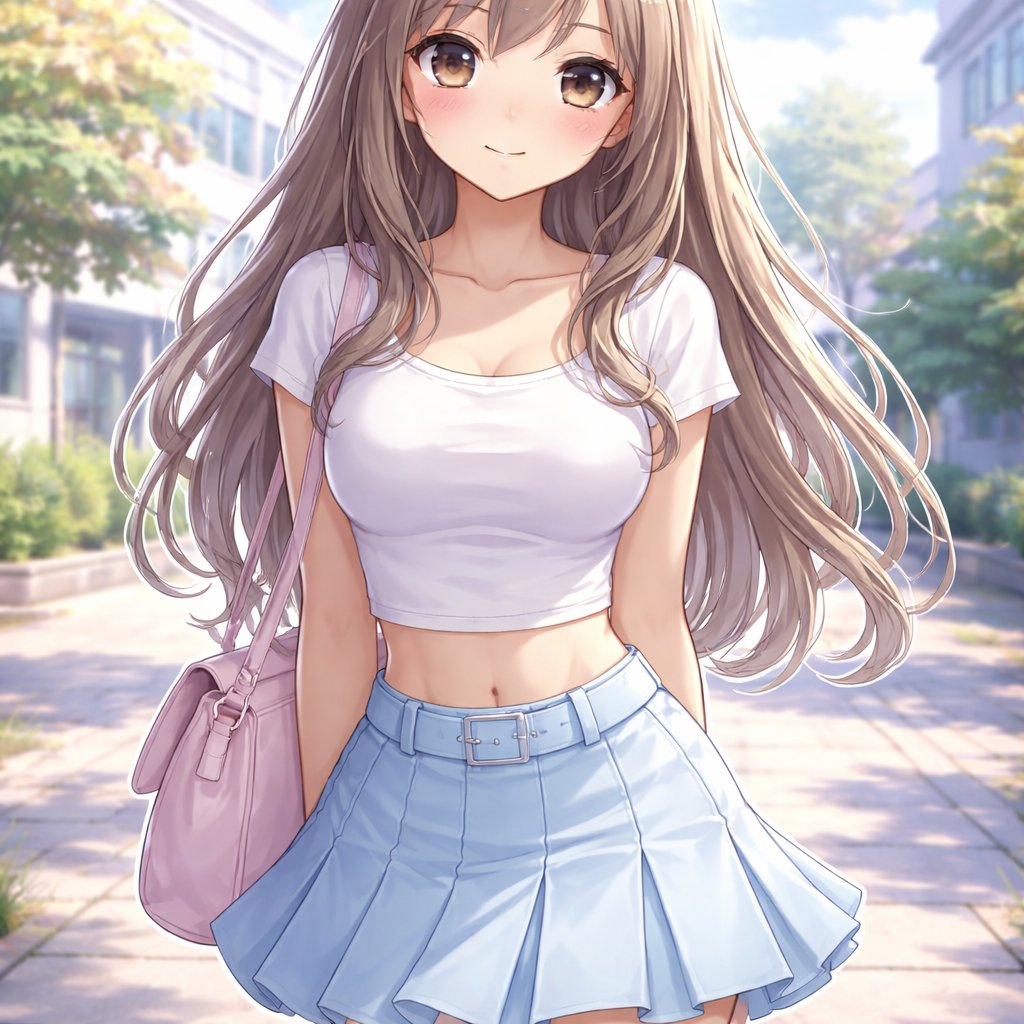 Hot Anime girl at the school in a white loose crop top and sky blue mini mini skirt.