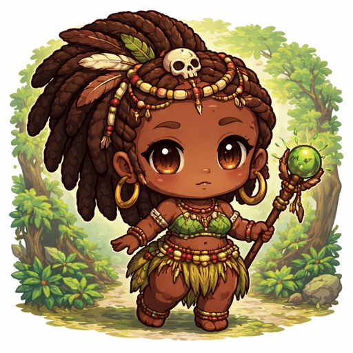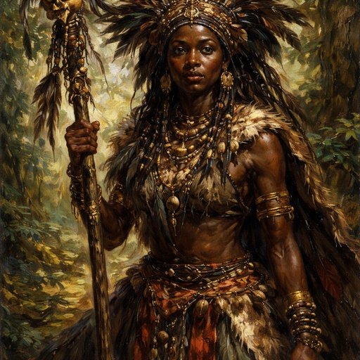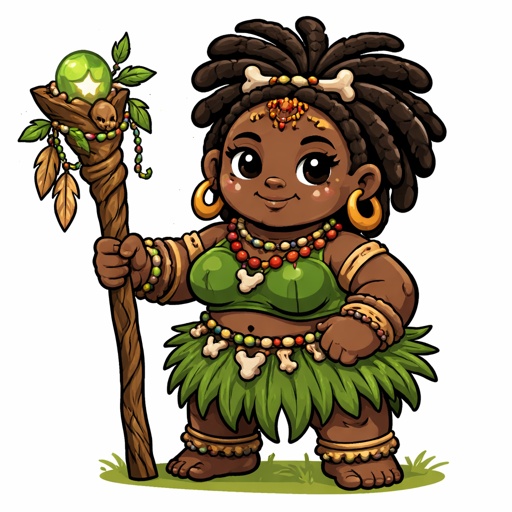 An african witch priestess from the forest tribe holding a wooden staff. Thick body mid heavy weight.