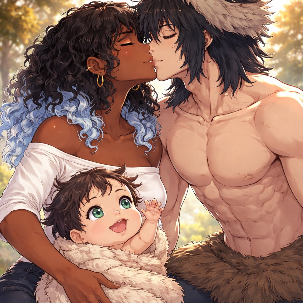 Baby Inosuke been held by a dark skin woman with black curly hair with baby blue faded tips and been carried by grown Inosuke and the woman and grown Inosuke are kissing and the baby is looking up at them