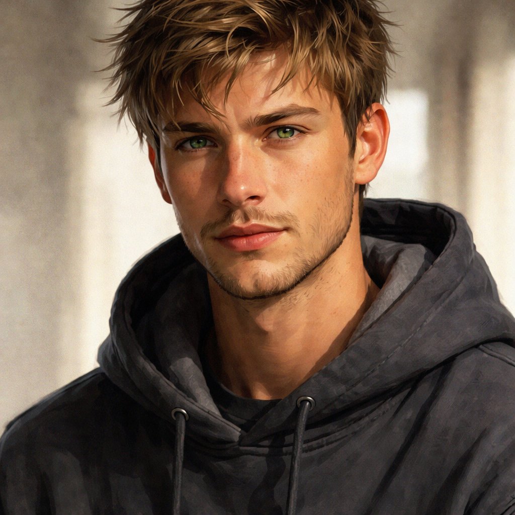 Man in his mid-twenties, short messy dirty blonde hair, green eyes, wearing a hoodie. Chiseled jaw and narrow eyes. Tan skin.