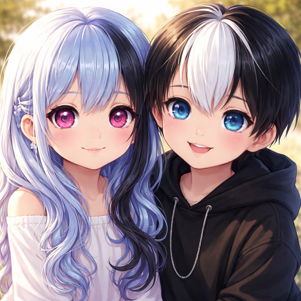 Two small children one girl with blue, white hair and pink eyes and one boy with short symmetrical white, black hair and blue eyes