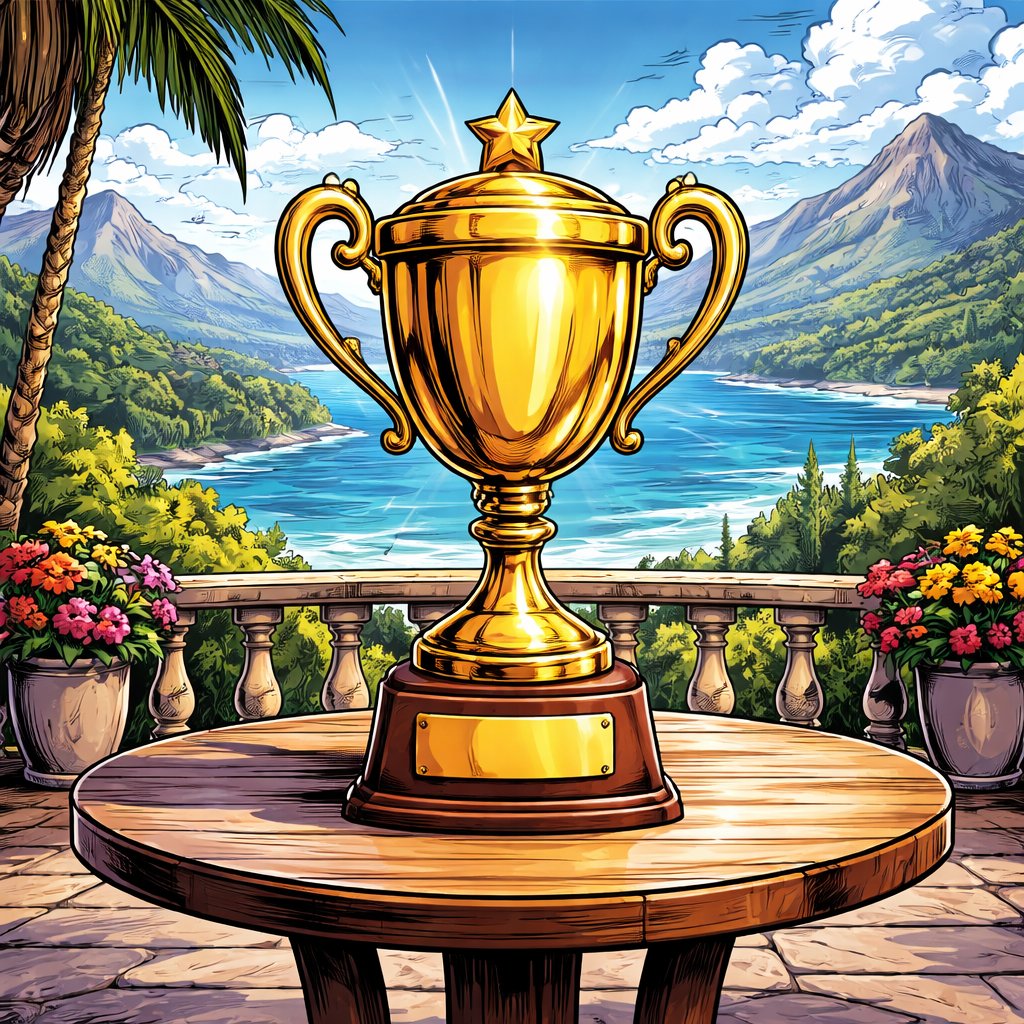 Realistic, refined, a magnificent trophy sits on a table. The table is on a terrace with a magnificent view of the ocean...