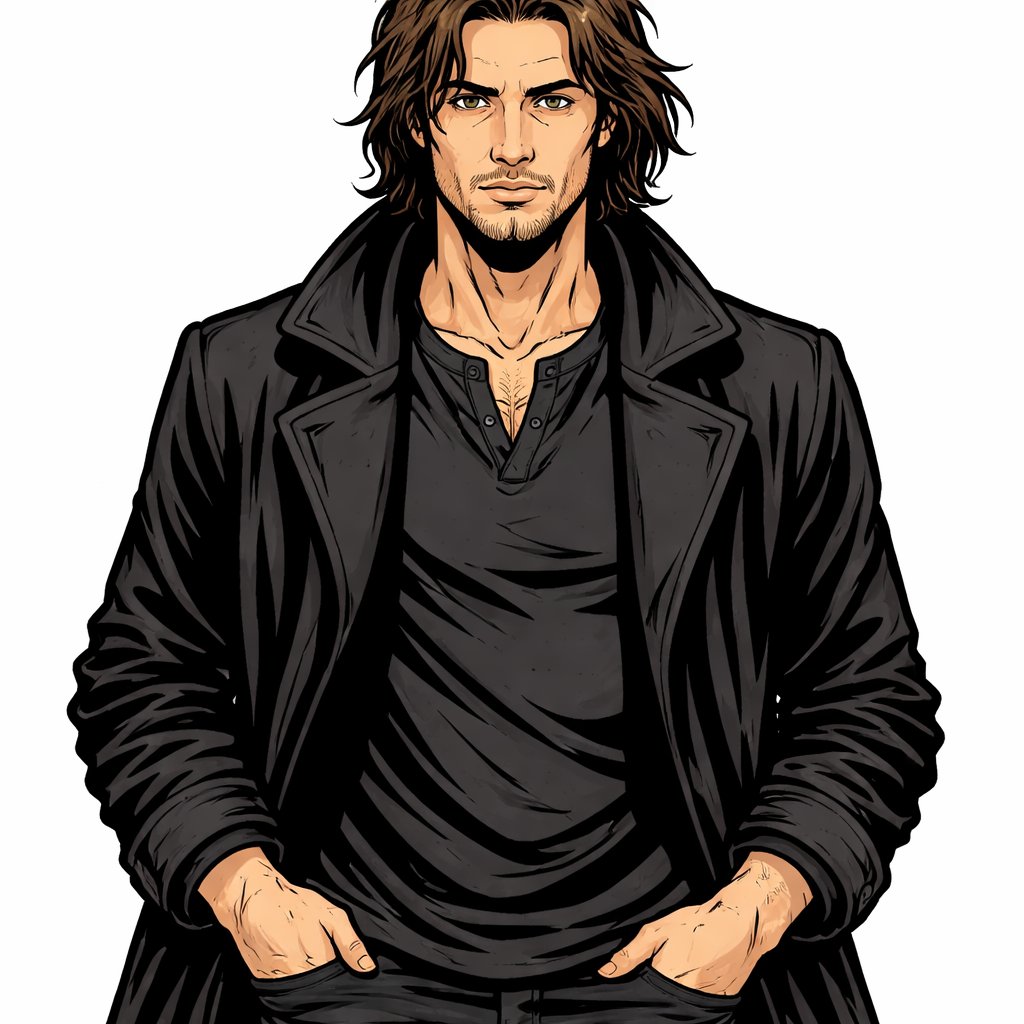 Realistic refined a man late 20s long brown hair he wears a dark robe with no hood. No superhero stuff no magic stuff just straight up no speech bubbles.