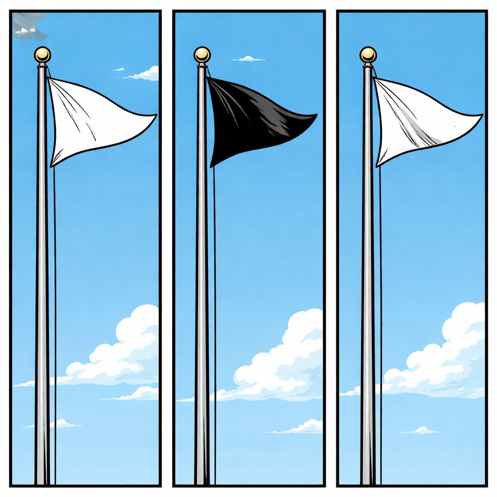Three views of a flag pole with a blank flag, a black flag and a white flag. The flag should be triangular