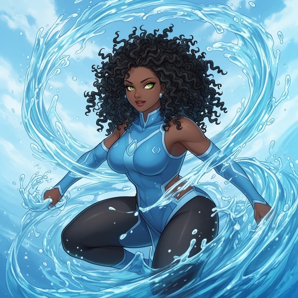 Black female with curly , hazel green eyes and a curvy figure who's a water bender