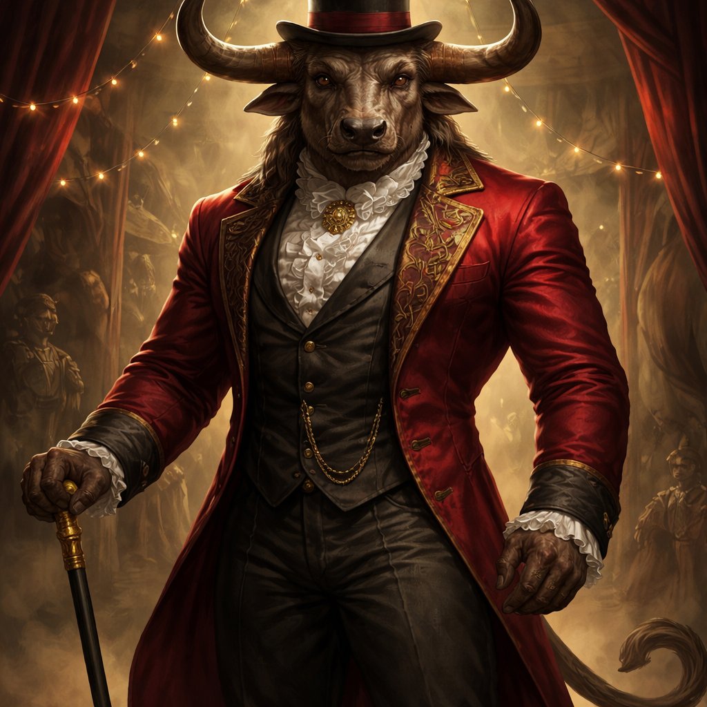 A male Minotaur that’s 6 1/2 feet tall and His Key Features are. His head looks like a mixture between Cretan bull and a human with deep set cattle like brown eyes with a fairly flat face, large powerful gleaming curved horns like his fathers. He has a well~proportioned figure/body and a long tail, with his skin/fur a captivating Taupe color. He works at freak show as the ringmaster, his outfit consists of a crimson tailcoat, frilly shirt, stunning blazer, pants and top hat. His abilities are Reality Rejection, Time Manipulation (Chronokineses), Zoolingualism (Language of Cattle only), Human Speech.