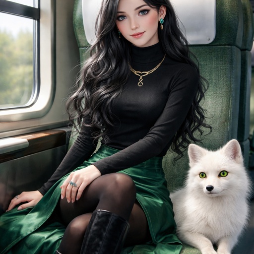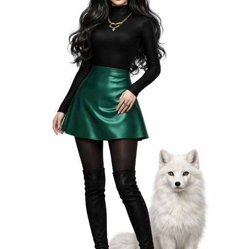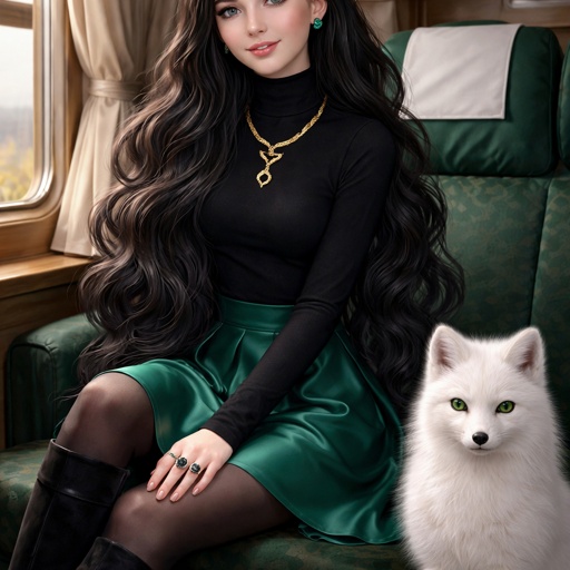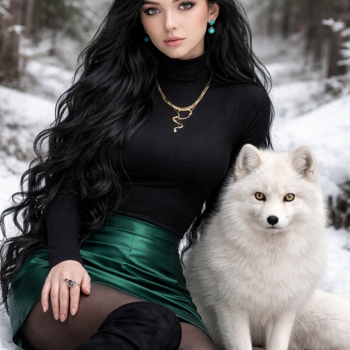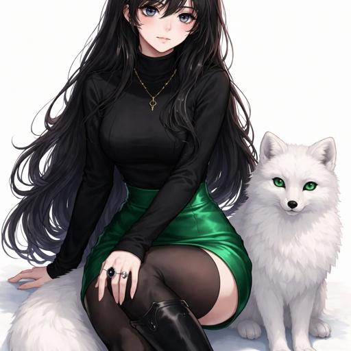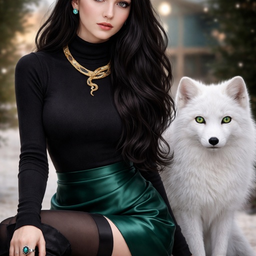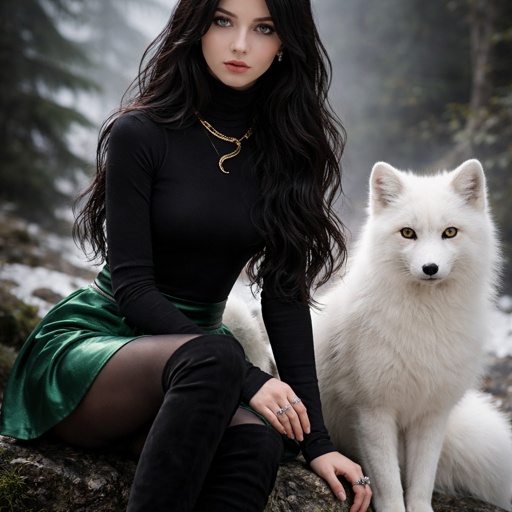 A teenager girl sitting with long black hair and grey eyes. Her hair is set in soft waves resting just above her but. Her eyes are storm grey. She is wearing a black long sleeve turtleneck and a satin Green skirt black tights and black thigh high boots. She has a small golden necklace of a snake and a silver ring with a b on the top to the left of the b is a black diamond and to the right is an emerald. She has an arctic fox next her with bright green eyes. She has fare skin and she has emerald stud earrings in both ears you can see her full body and she is wearing a small diadem the diadem is black with emerald accents
