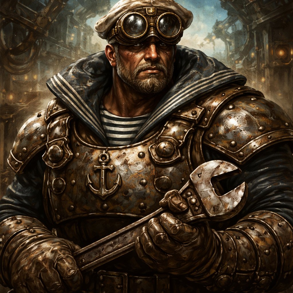 A Tortle fighter with a sailor background. He wears a sailor’s uniform