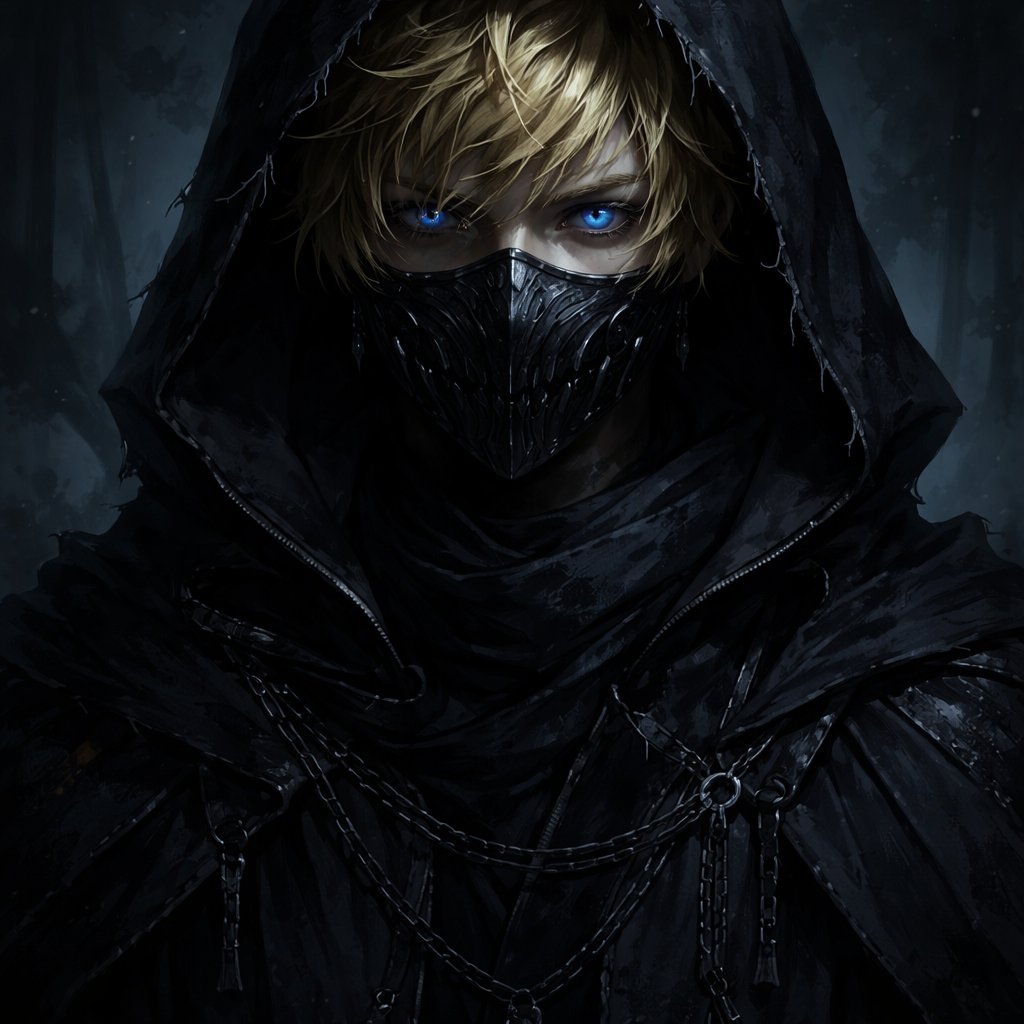 A 17 year old boy who has gold hair and has blue eyes. He is wearing all black. There is a mask that covers his mouth and nose. There is also a hood that covers part of his hair but some strands still show.