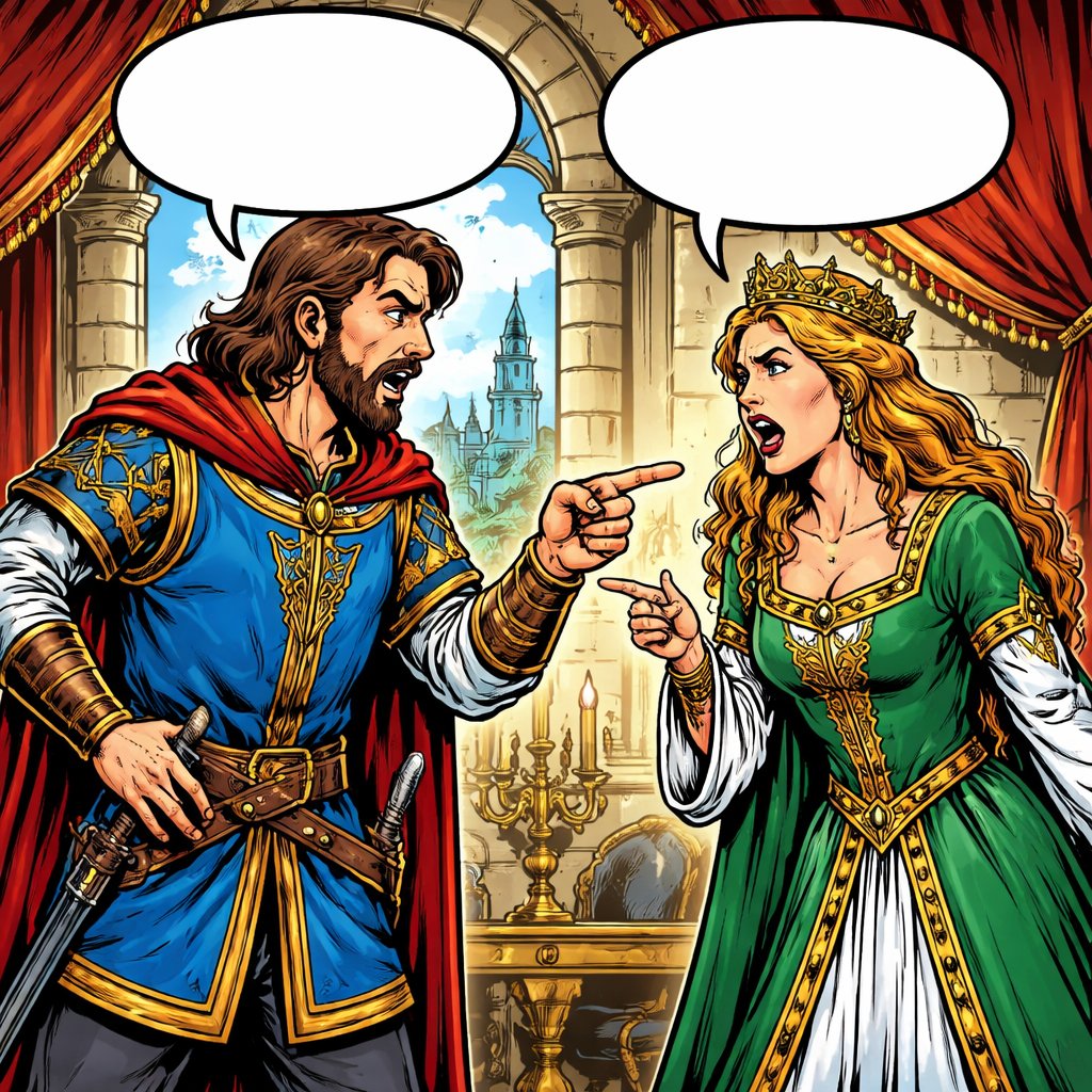 Long shot full body. No finger pointing. Mediaeval noble dressed husband arguing with wife in a castle room