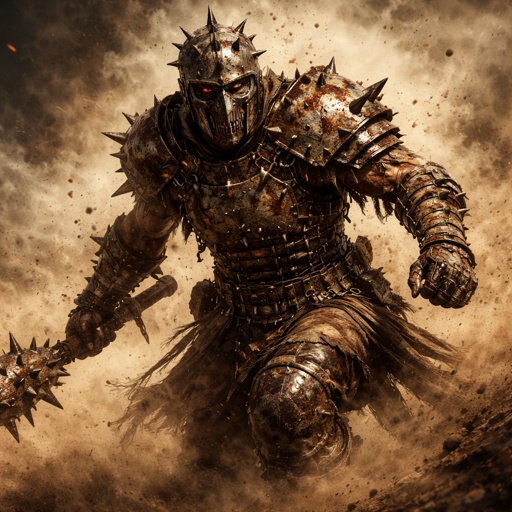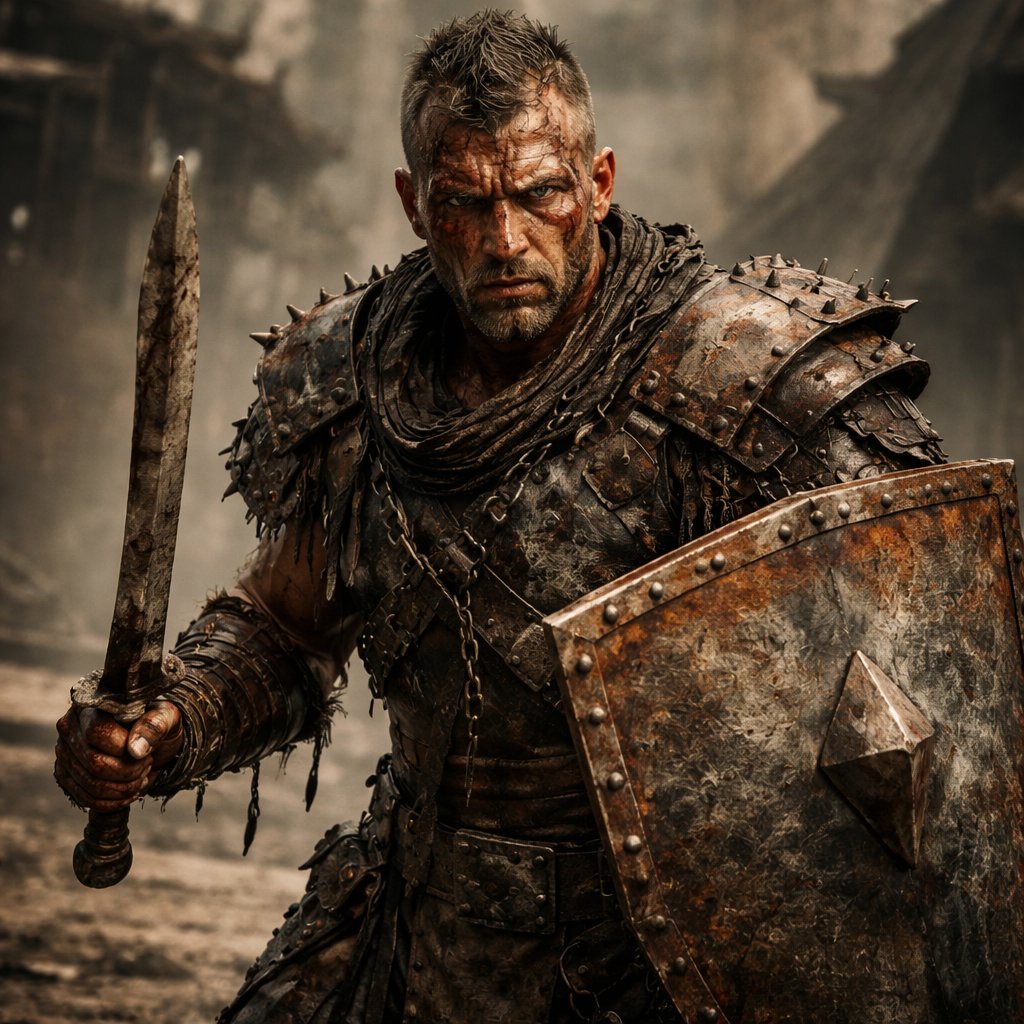 Roman gladiator: A muscular fighter armed with trident and net, standing victorious in the Colosseum. Bloodied and scarr...